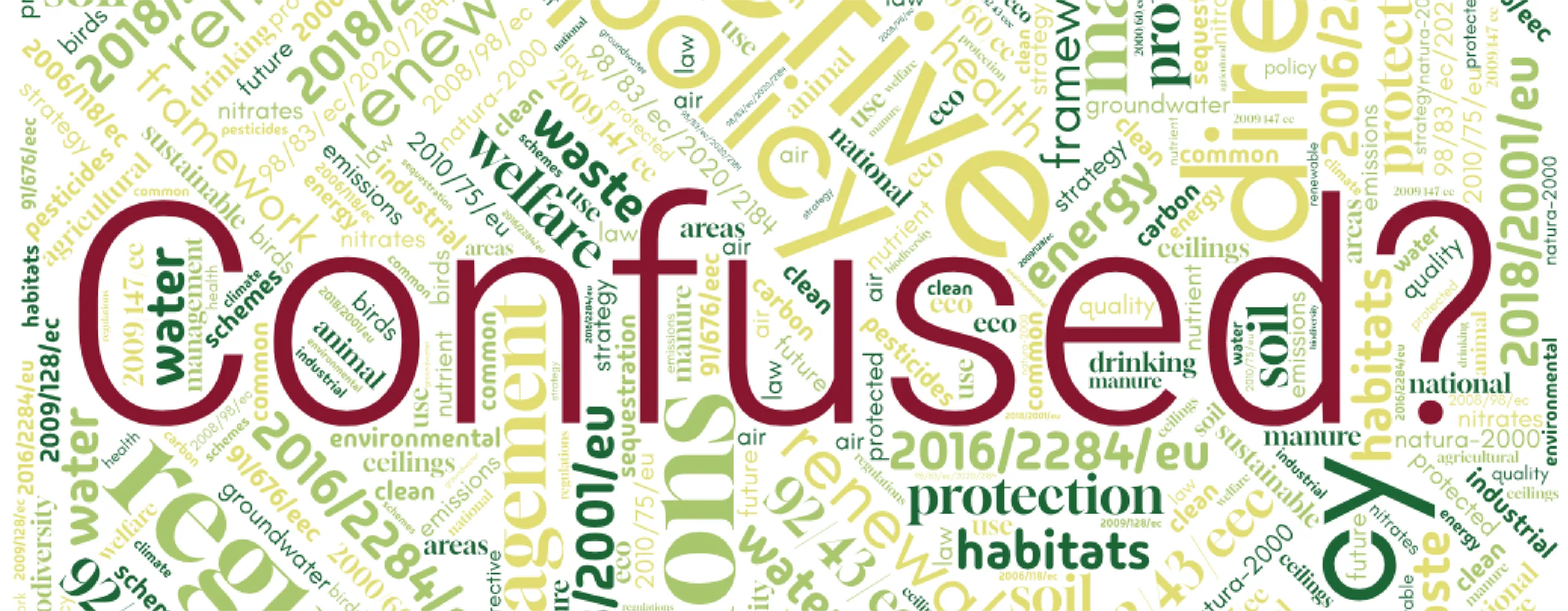 You can find out more regarding pan-EU regs at EUR-Lex, e.g. Nitrates EUR-Lex Link Water EUR-Lex Link Habitats EUR-Lex Link Birds EUR-Lex Link Pesticides EUR-Lex Link (CAP) Link / Link / Link Emissions EUR-Lex Link Renewable EUR-Lex Link Landfill EUR-Lex Link Climate EUR-Lex Link.